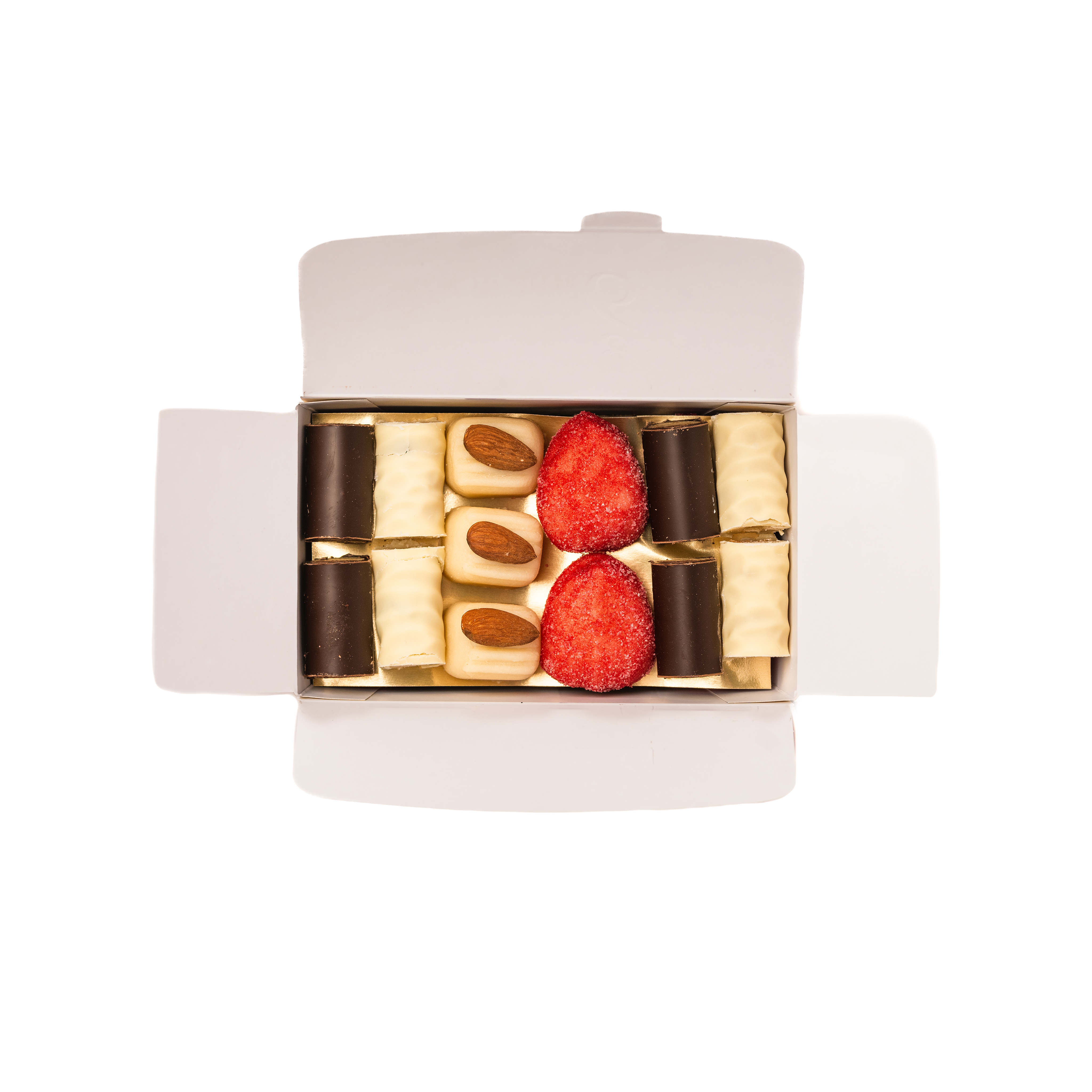 Sucre, masse de cacao, beurre de cacao, lait entier en poudre, noisettes, crème de lait, sirop de cuberdon (sirop de glucose, glucose, arômes, colorants: carmin, charbon végétal), beurre anhydre, beurre, sirop de glucose, lait condensé sucré, émulsifiant : lécithine de soja, sucre inverti, sirop de sorbitol, poudre de caramel avec matière grasse laitière (poudre de lait écrémé, lactosérum en poudre (lait), sucre, matière grasse laitière anhydre, arôme), citron confit, farine de blé, café, amandes, arômes, farine de riz, dextrose, sirop de glucose-fructose, poudre de cacao maigre, sucre de canne, humectant : sorbitol, miel, glycérine végétale, lactose, conservateur : sorbate de potassium, poudre de cacao alcalinisé, framboises, jus de framboise concentré, sucre caramelisé, acidifiant : acide citrique, invertase, noyaux d'abricots, noyaux d'abricot amers, colorants (rouge betterave, complexes cuivriques de chlorophylle), sel, amandes amères, albumine (oeuf), sel de Guérande, jus de citron concentré, poudres à lever (pyrophosphate disodique, bicarbonate de sodium), amidon modifié, dioxyde de carbone, épaississants (agar-agar, pectine), concentrés végétaux (carotte, hibiscus), pectine, extrait de curcumin. Avec du chocolat au lait (min. 30% de cacao, min. 22% de matière sèche de lait), chocolat noir (min. 54% de cacao), chocolat blanc (min. 25% de cacao, min. 22% de matière sèche de lait), chocolat blanc au caramel (min. 26% de cacao). Contient des traces de fruits à coque (pistaches, noix).