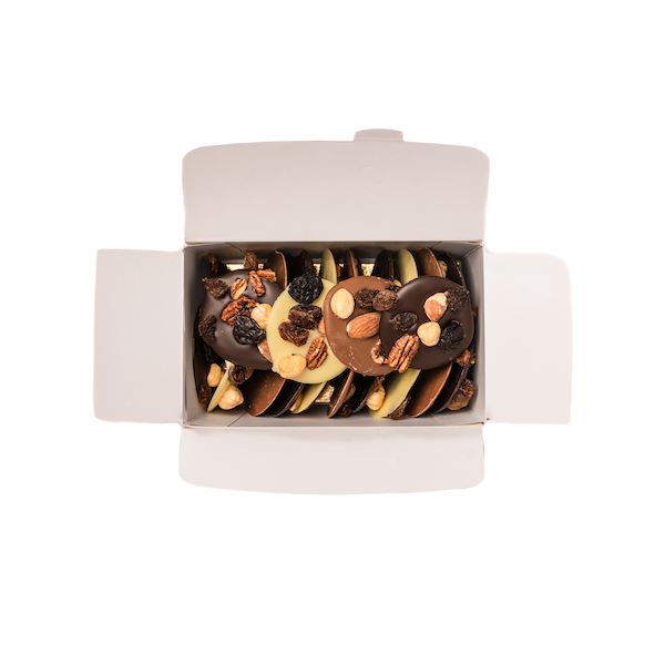 Sucre, raisins secs, masse de cacao, beurre de cacao, amandes 8%, noix de pécan 8%, noisettes 7%, lait entier en poudre, émulsifiant : lécithine de soja, arôme, sirop de glucose, miel. Avec du chocolat noir (min. 54 % de cacao), chocolat au lait (min. 30 % de cacao, min. 22 % de matière sèche de lait), chocolat blanc min. 25% de cacao, min. 22% de matière sèche de lait). Contient des traces de gluten, d'arachides et de sésame. Le chocolat noir contient aussi des traces de lait.