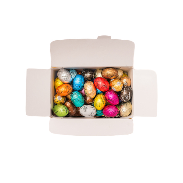 Chocolat au lait (min. 30% solides du cacao): sucre, lait entier en poudre, beurre de cacao, masse de cacao, émulsifiant: lécithine de soja, arôme naturel de vanille, colorant : curcumin, carmin, annato, lutéine, complexes cuivriques de chlorophyle. Contient des traces d’œufs et fruits à coques (noisettes, amandes, pistaches et noix).