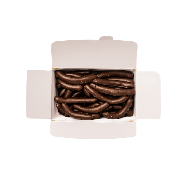 Chocolat noir (min. 54% solides du cacao): masse de cacao, sucre, beurre de cacao, émulsifiant: lécithine de soja, colorant : curcumin, carmin, annato, lutéine, complexes cuivriques de chlorophyle. Contient des traces d’œufs, lait et fruits à coques (noisettes, amandes, pistaches et noix).