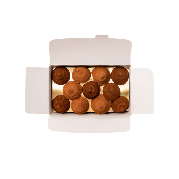 Sucre, beurre anhydre, pâte de cacao, crème de lait, sirop de glucose, beurre de cacao, lait entier en poudre, sucre inverti, cacao dégraissé en poudre, poudre de cacao, spéculoos (farine de blé, sucre de canne, beurre, miel, farine de soja, bicarbonate de sodium, cannelle), eau, émulsifiant : lécithine de soja, noyaux d'abricot, noyau d'abricot amer , épices, albumine (œuf), amandes, arôme. Avec chocolat au lait (cacao min. 30%, extrait sec du lait min. 22%), chocolat noir (cacao min. 54%). Truffe Classique : Ganache aux chocolats noir et lait - Truffe Noire : Ganache au chocolat noir 85% cacao - Truffe Speculoos : Ganache au chocolat au lait et éclats de spéculoos. Peut contenir des traces de fruits à coque (noisettes, amandes, pistaches, noix), gluten (orge).